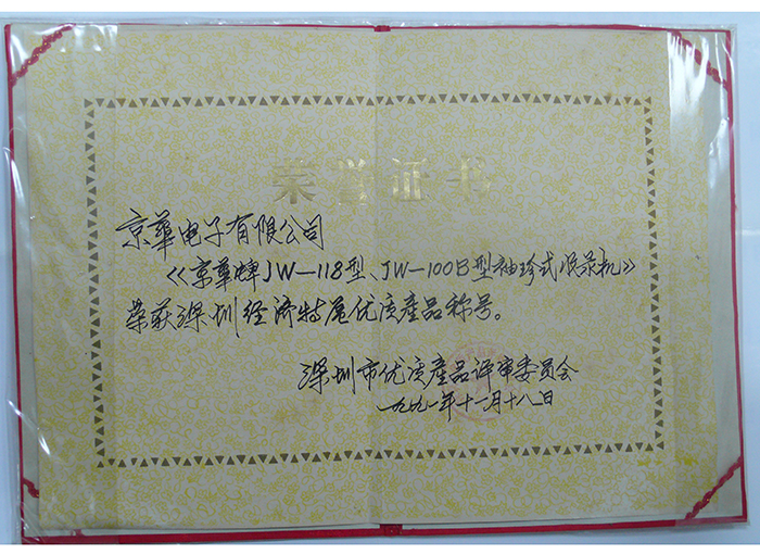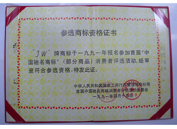 • (1991.4)JW首屆中國馳名商標參選資格證